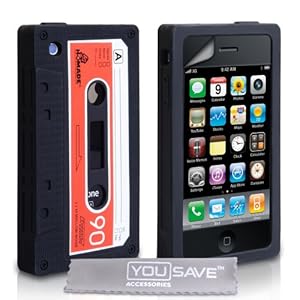 Yousave Accessories TM Zubehör Kühl Schwarz Und Rot Silikon Gel Retro Kassette Stil Schutzhülle Für Das Apple iPhone 3 / 3G / 3GS Mit Displayschutz Film Und Graues Micro Faser Poliertuch